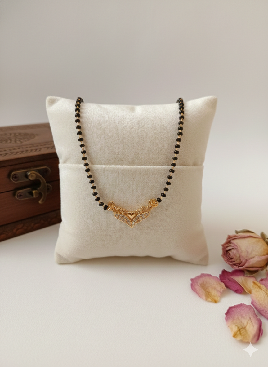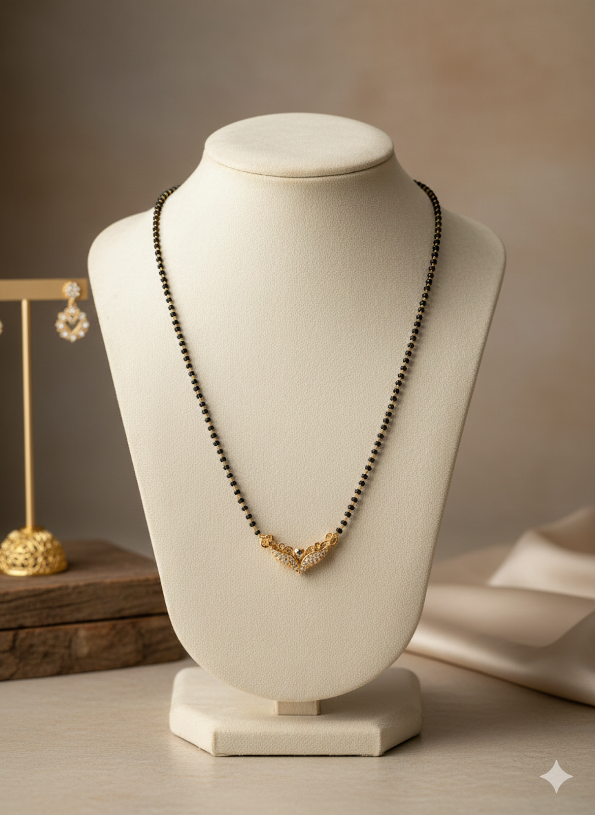 Celebrate the sacred bond of marriage with a touch of contemporary sophistication. This “Ethereal Wing” Mangalsutra is designed for the modern woman who values tradition but embraces modern style.