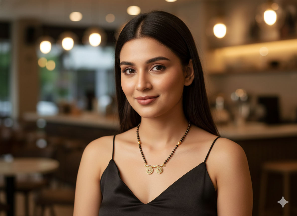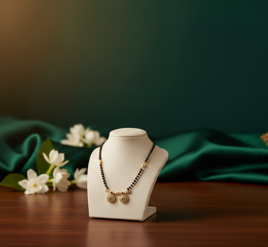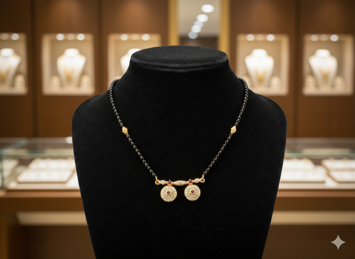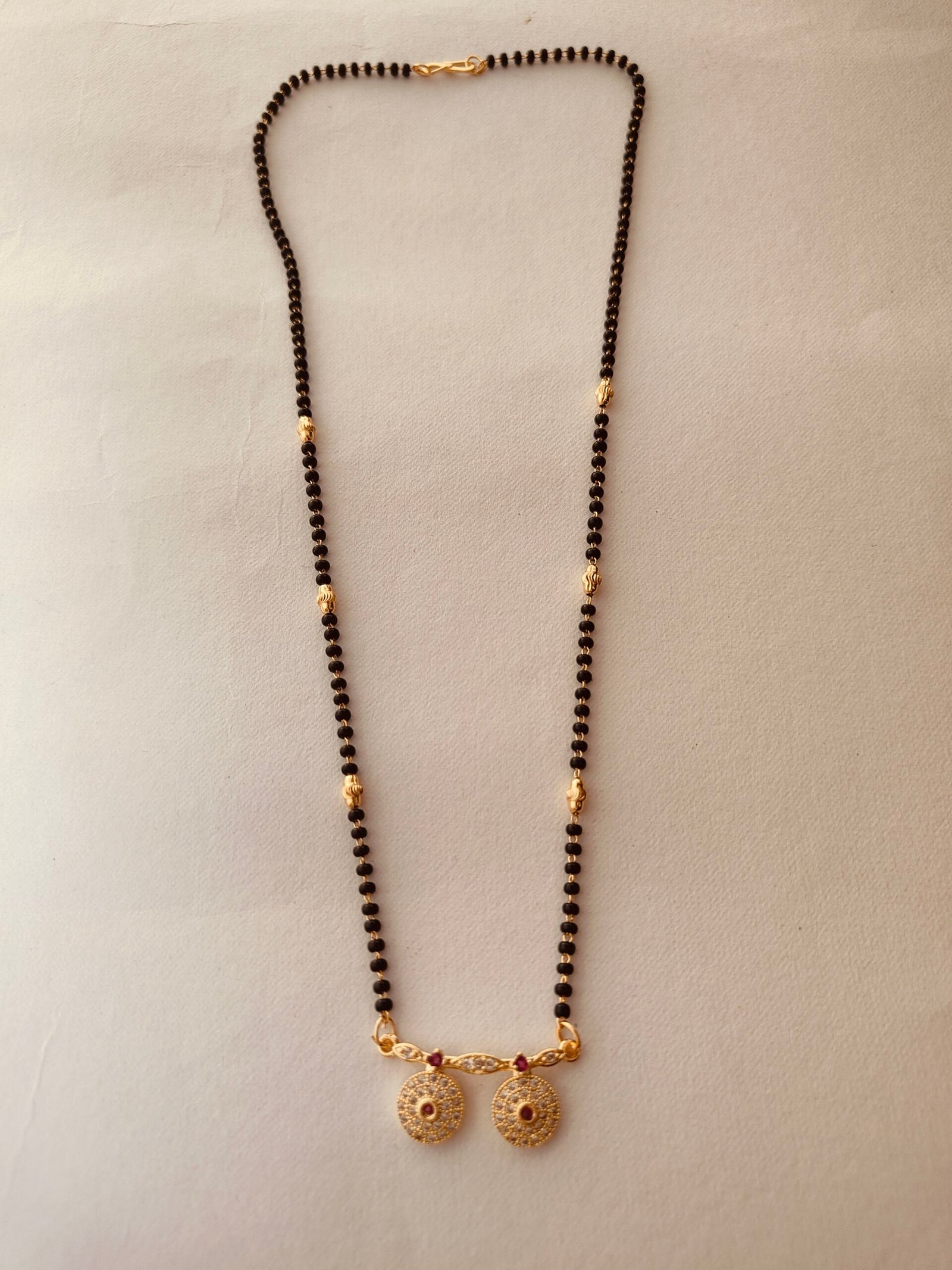Yeh mangalsutra ek perfect blend hai traditional sanskriti aur contemporary style ka. Ismein double circular “Vati” style pendant diya gaya hai, jo suhaag ki nishani maana jata hai. Pendant ko chamakdar American Diamonds (CZ stones) aur beech mein laal Ruby-colored stones se sajaya gaya hai. Iski black bead chain (mangalsutra mala) mein beech-beech mein golden beads ka kaam hai, jo ise ek premium look deta hai. Daily wear ho ya koi function, yeh har occasion ke liye behtareen hai.
