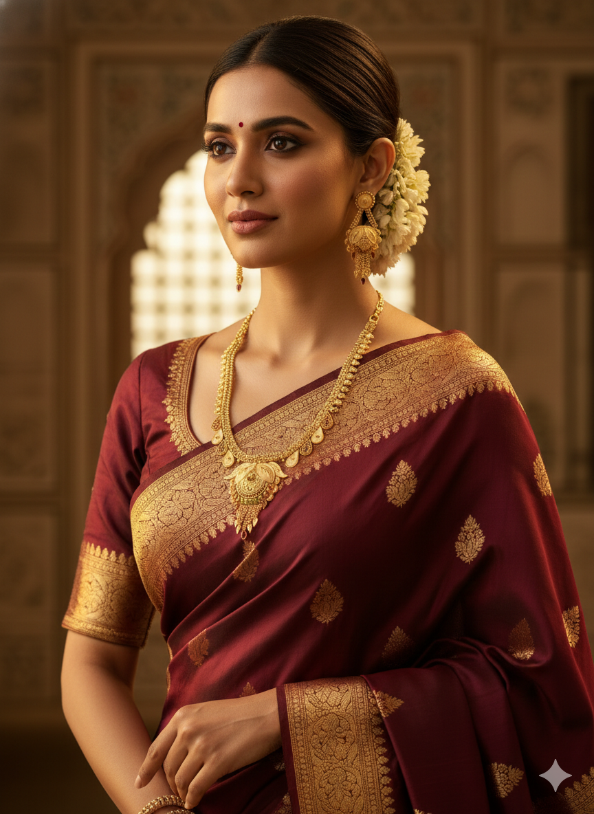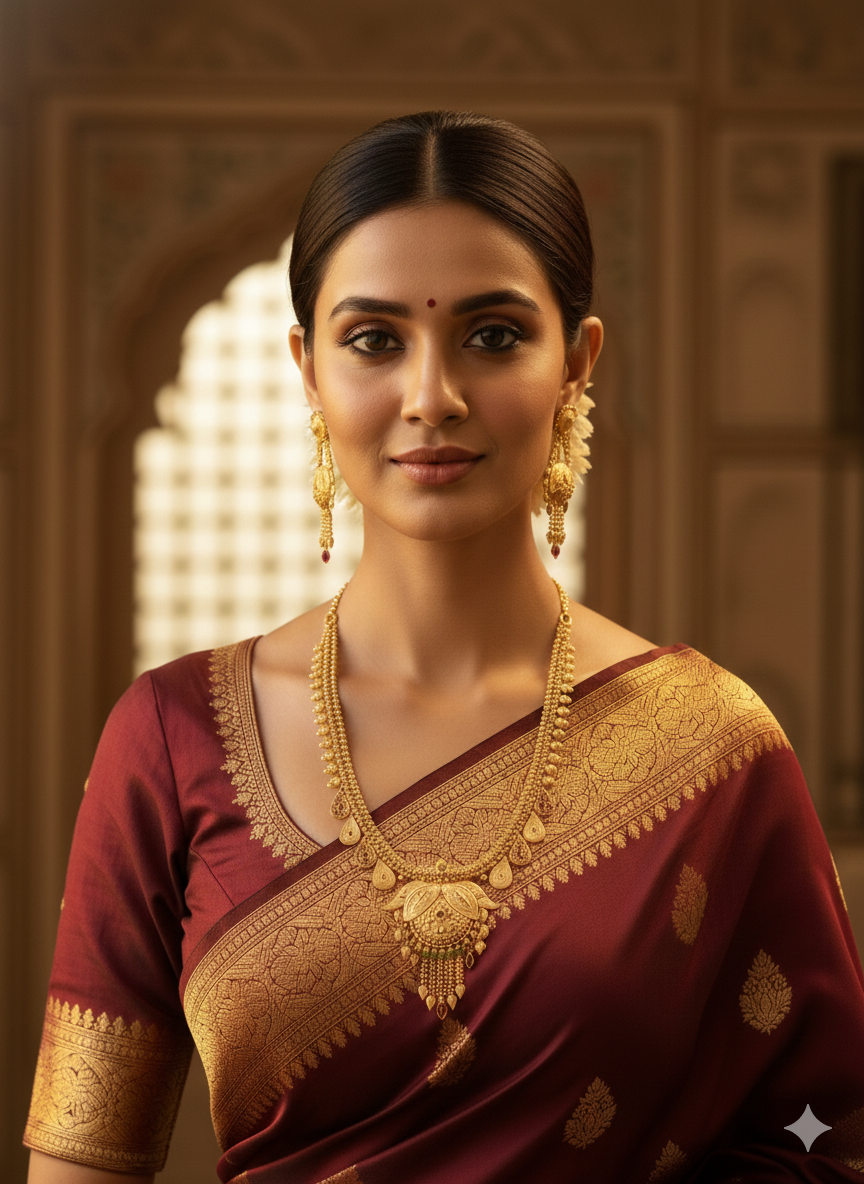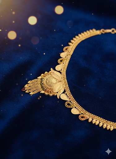 Experience the grandeur of real gold without the heavy price tag. This stunning 1 Gram Gold-Plated necklace set is a masterpiece of traditional craftsmanship. Designed with a rich antique matte finish, it features a magnificent floral-motif central pendant and a dual-strand textured chain.