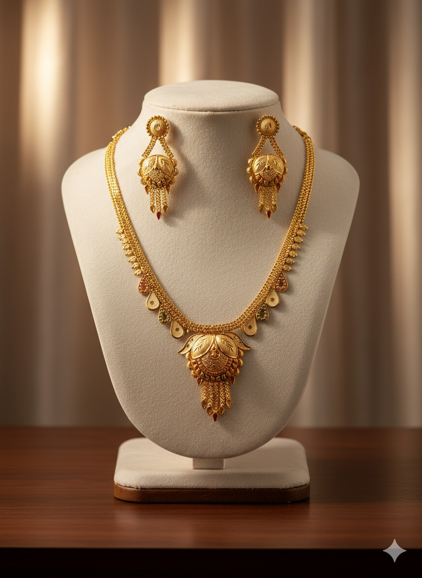 The high-quality gold plating ensures a long-lasting shine that mimics the look of 22K solid gold. Each detail, from the delicate leaf carvings to the dangling gold beads, is handcrafted to perfection. This set is the ultimate choice for brides, bridesmaids, or anyone looking to make a royal statement at weddings and festivals.