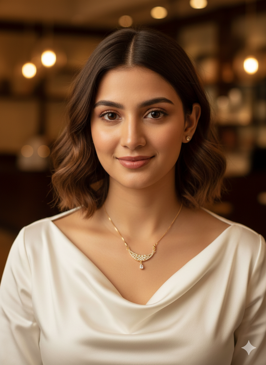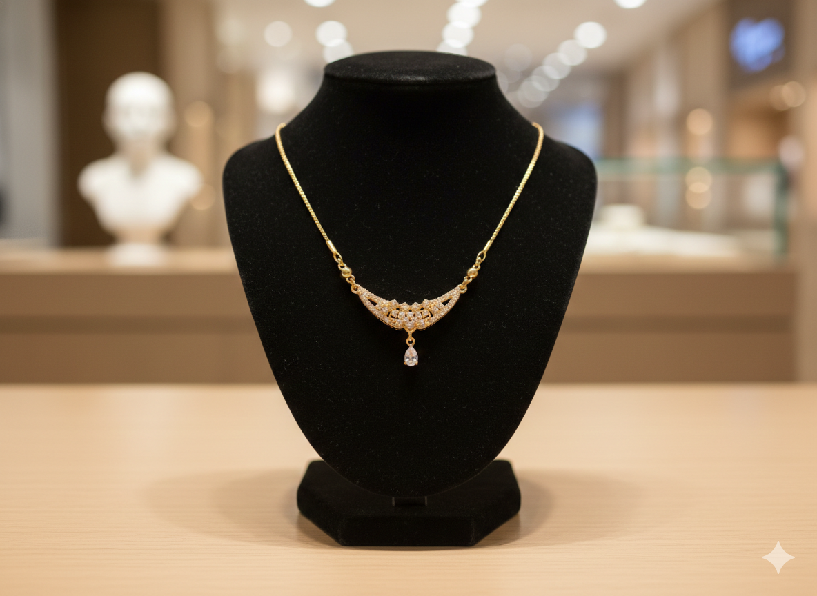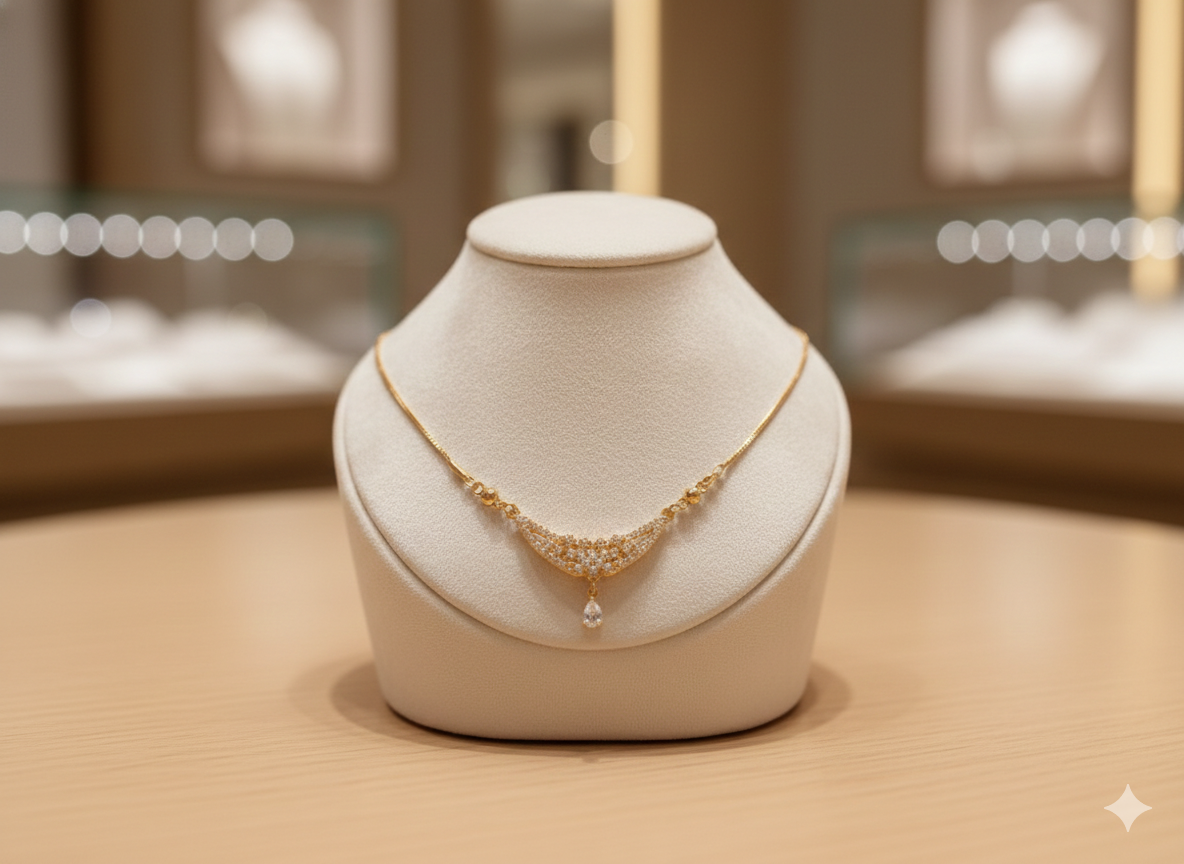 The centerpiece features a graceful crescent-shaped motif intricately pavé-set with shimmering stones that capture the light from every angle. Suspending from the center is a delicate pear-cut drop, adding a touch of movement and refined elegance to the piece. Crafted with a high-polish yellow gold finish and a slender, comfortable chain, this necklace sits perfectly on the collarbone, making it an ideal choice for both daily grace and special celebrations.