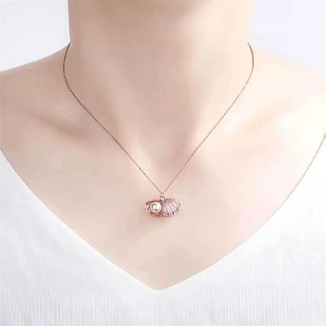 (14) Rose Gold Seashell Locket Necklace – 18-Inch Chain with Shimmering Crystal Shell & Radiant Hidden Pearl