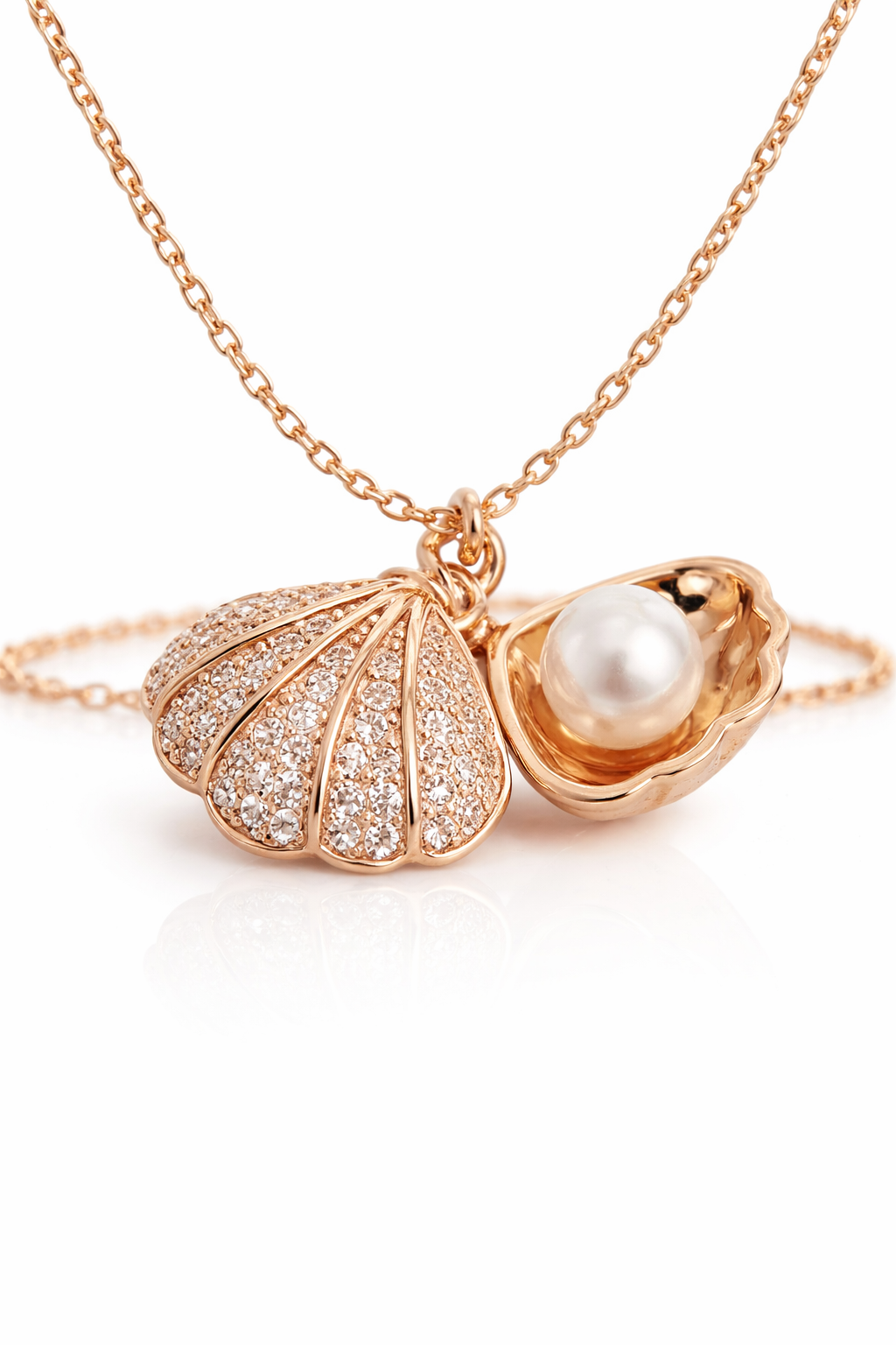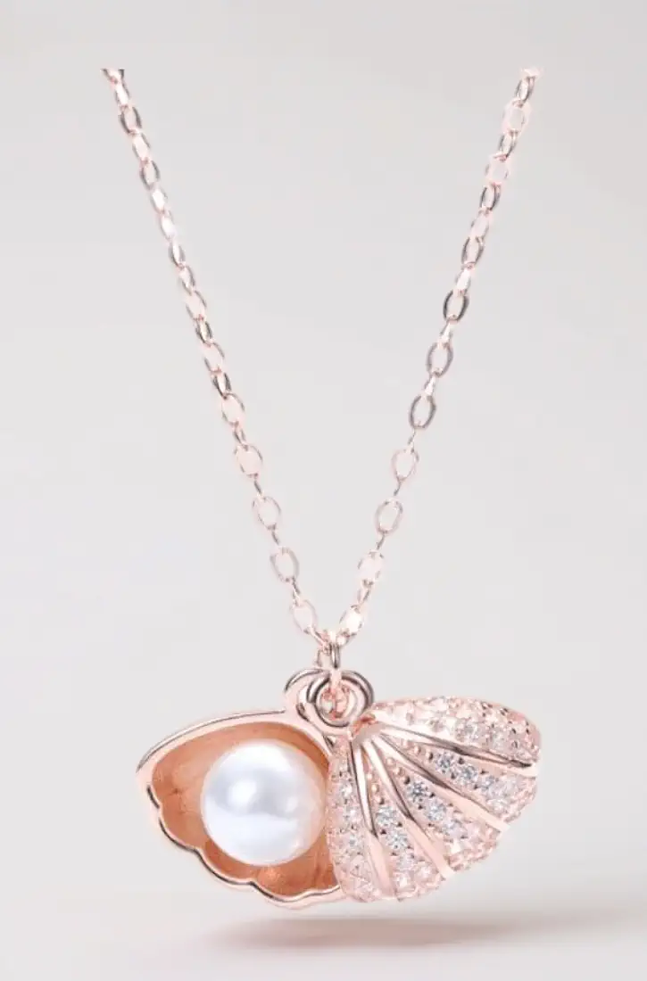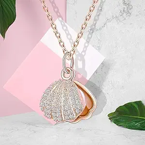 Embrace the magic of the ocean with this exquisite Rose Gold Seashell Pearl Locket Necklace. This isn’t just a piece of jewelry; it’s a tiny treasure chest worn around your neck. The pendant features a meticulously detailed scallop shell, half-encrusted with shimmering micro-crystals that provide a sophisticated sparkle.