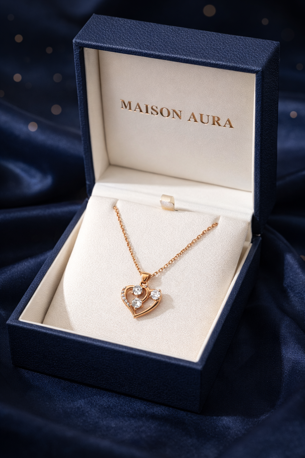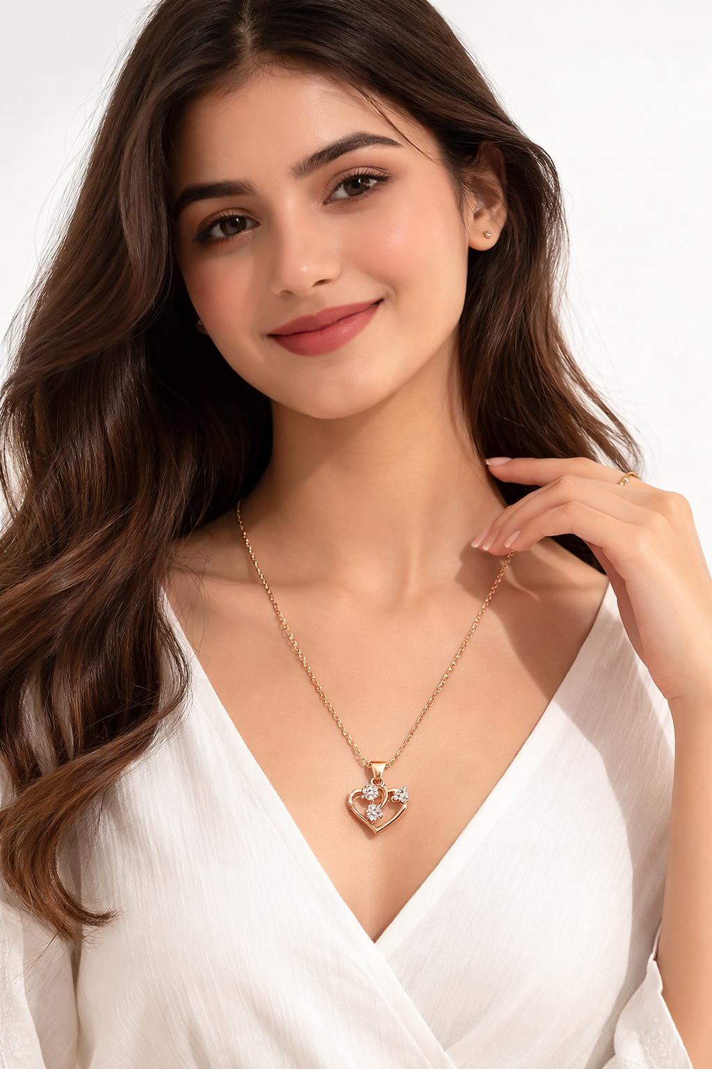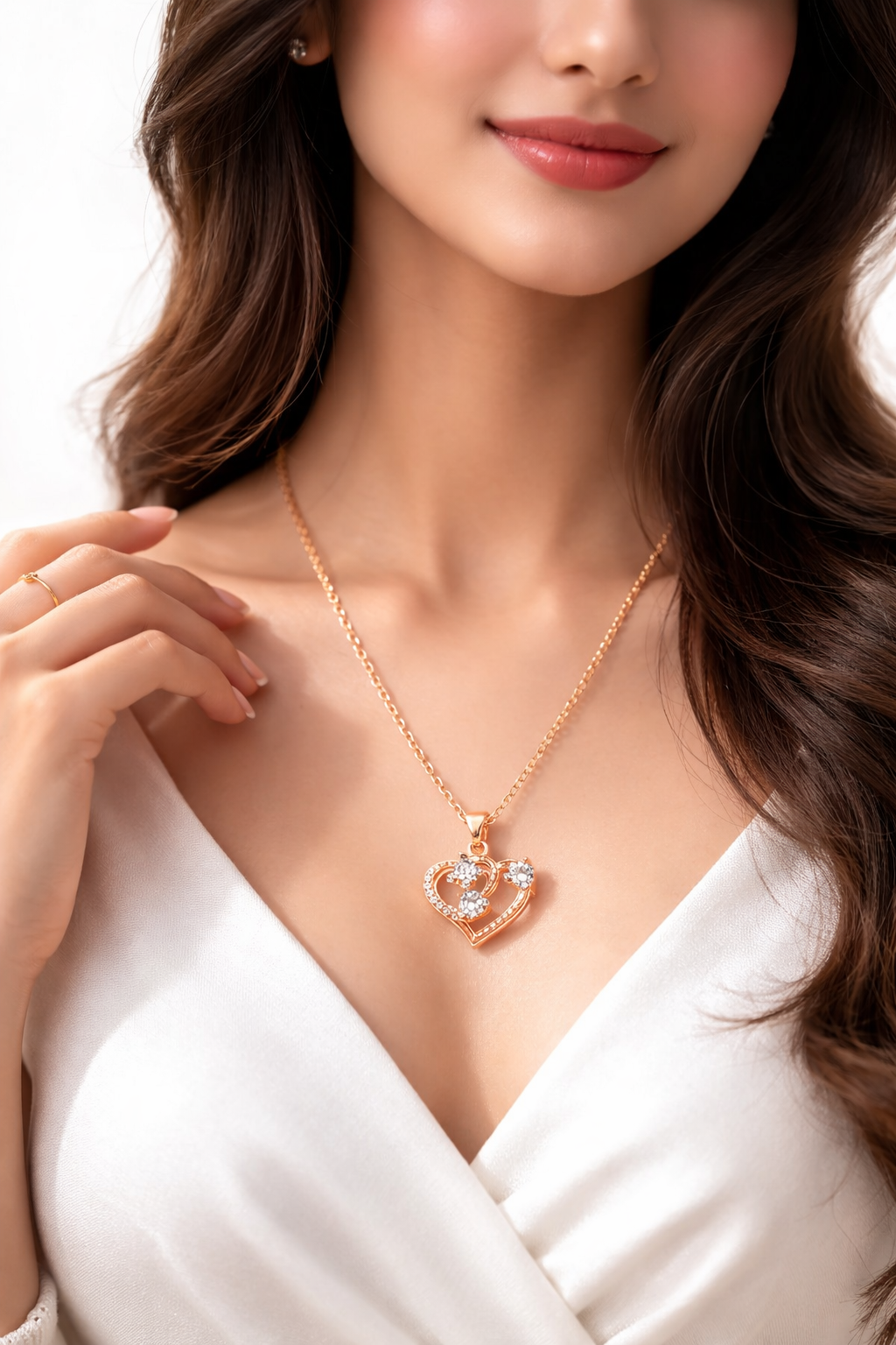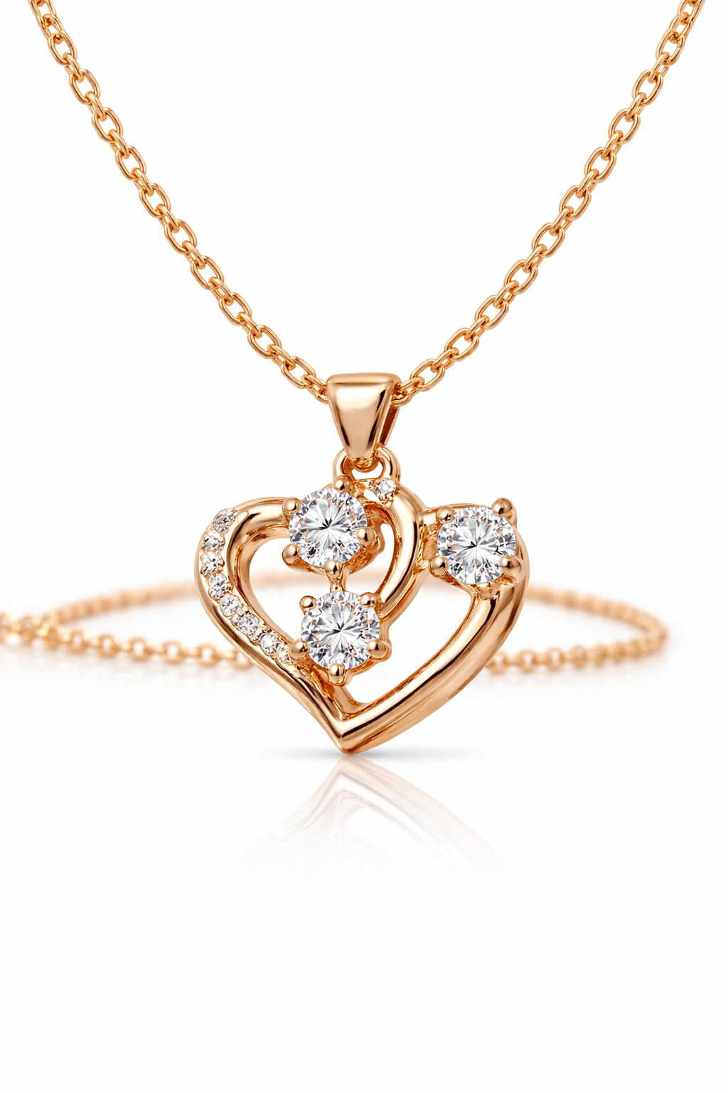 Celebrate your special moments with this stunning Rose Gold Interlocking Heart Pendant. This necklace is more than just jewelry; it is a symbol of affection and grace. The pendant features a modern, fluid heart silhouette that gracefully curves around three brilliant, round-cut center stones. To add an extra touch of radiance, one side of the heart is delicately lined with shimmering micro-accents that catch the light from every angle.