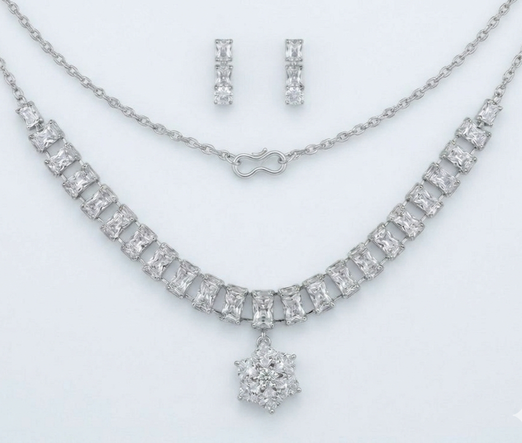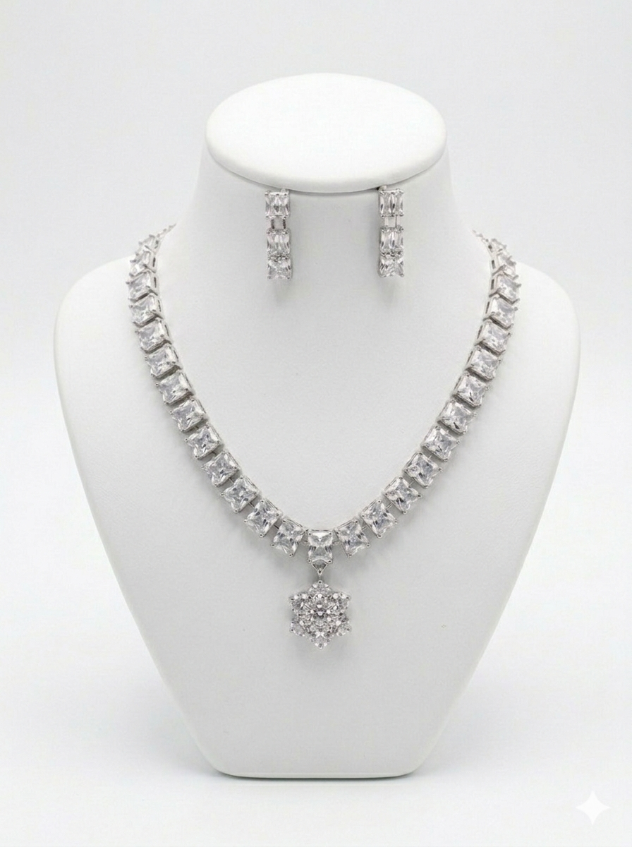 Elevate your jewelry collection with this masterpiece. This set features a high-luster silver-tone finish adorned with meticulously cut princess-cut (square) stones that lead to a stunning floral cluster pendant. It is designed for the woman who wants to make a statement without saying a word.