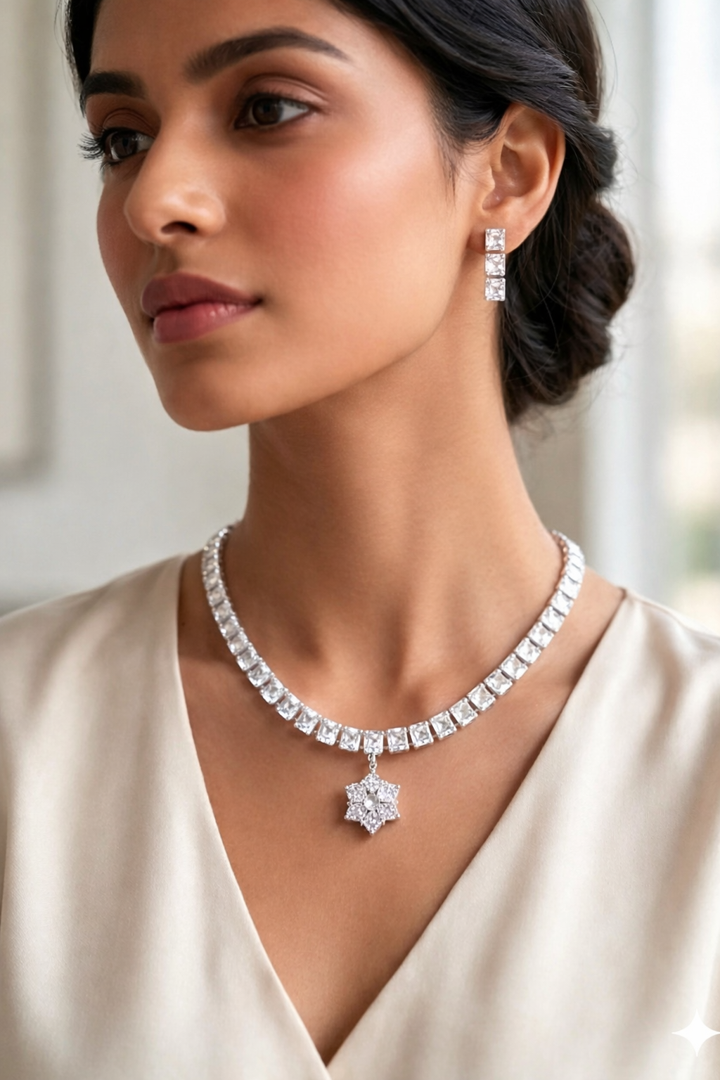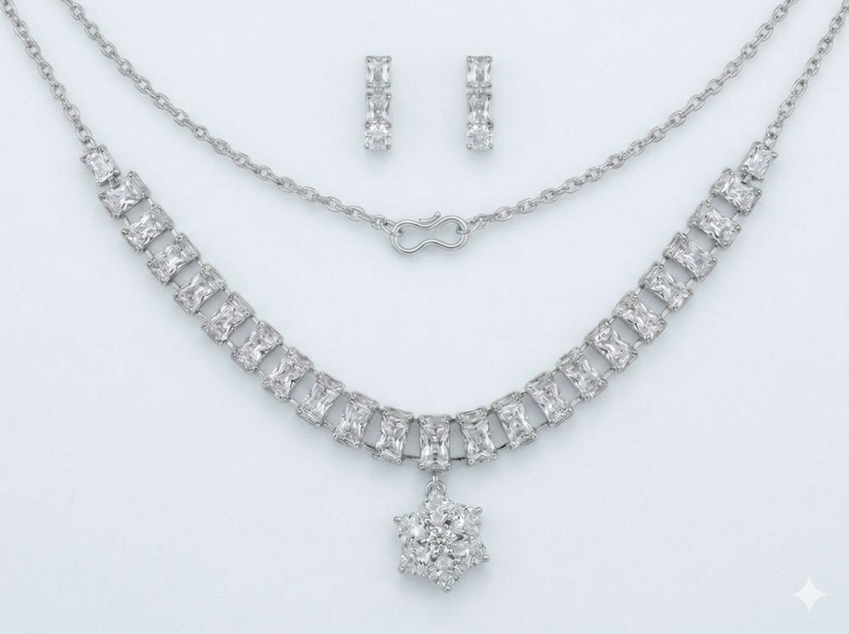 Stone: Radiant white square crystals aur center mein intricate floral cluster design.